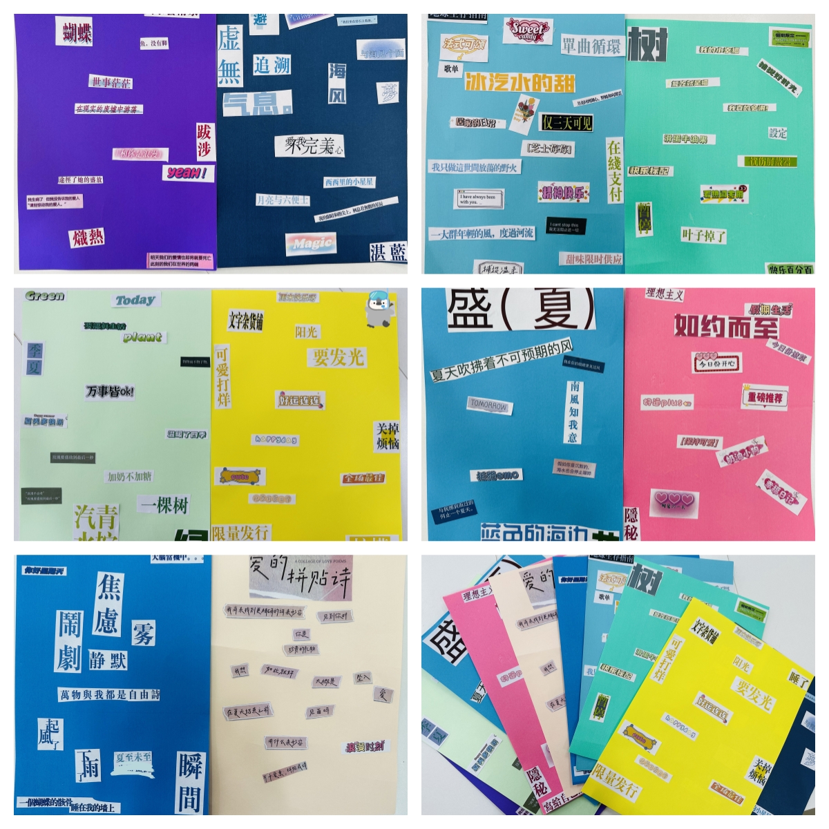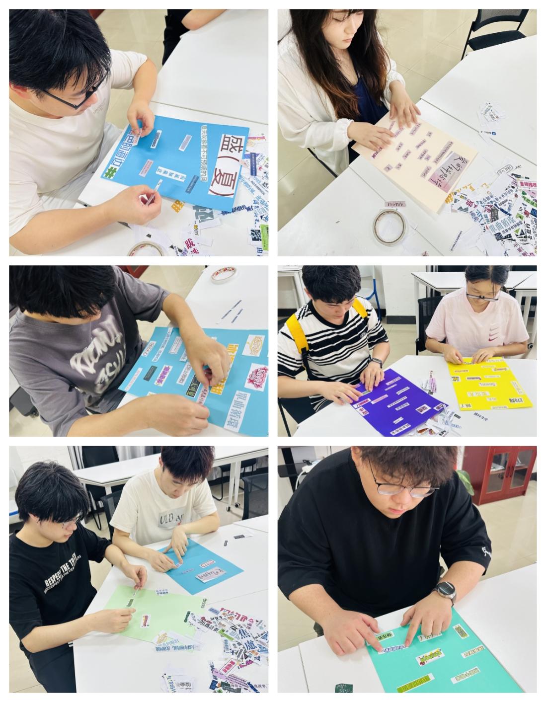 在创作环节,大家发挥自己的聪明才智,沉浸在自主动手创作的喜悦中,围绕“拆解与重构”主题,充分表达自己的创作思路和理念。专注地在各类素材中寻觅灵感,有人精心挑选出充满希望的词句,表达对未来的憧憬;有人将富有情感的文字与图案巧妙搭配,诉说着成长中的困惑与感悟。每一张拼贴诗作品都独一无二,是同学们内心世界的真实写照。一位参与活动的同学分享道:“在拼贴的过程中,我仿佛在和自己的内心对话,原本有些迷茫的情绪,通过这种方式得到了梳理,感觉轻松了许多。” 活动现场还设置了分享交流环节,同学们依次展示自己的作品,并讲述创作背后的故事和情感。不同的视角、各异的情感在交流中碰撞,引发了大家强烈的共鸣。大家相互倾听、相互理解,在温暖的氛围中感受着彼此的心灵温度。