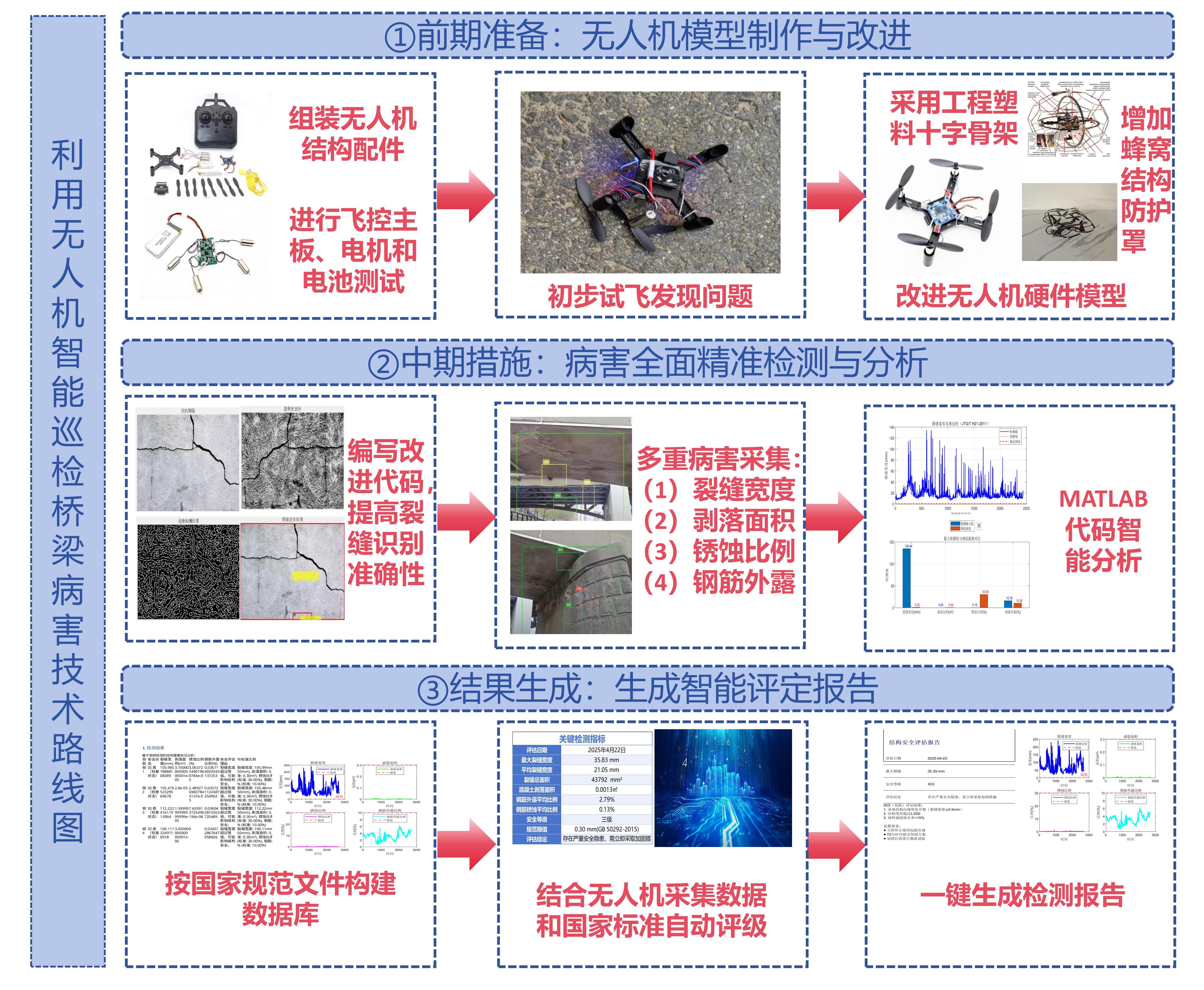 在周宇老师的带领下,实践团成员充分利用现代科技手段,对潜山市20余座桥梁进行了全面而细致的“体检”。团队采用人工检测与无人机航拍、AI智能识别相结合的方式,高效、精准地识别出桥梁的病害与隐患。在检测桥梁周边认真展开问卷调研,寻求附近居民意。