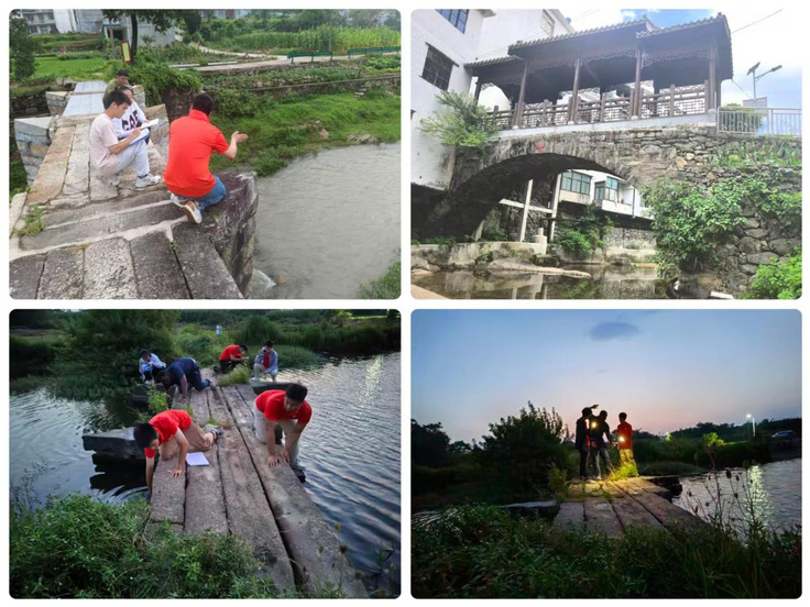 在落马桥的勘查现场,队员们发现这座位于潜山市余井镇黄岭村的清代石拱桥隐患突出:主拱西侧第三块拱石存在1.3米纵向裂隙,桥面因地基沉降倾斜度达4°,桥底藤蔓深入石缝导致风化加速。队员们当即标注“一级保护优先级”,并提出:先除藤蔓固裂隙、再用糯米灰浆补拱券的分级方案。 在太湖县陆冲古石拱桥,队员们通过AI图像识别比对历史照片;宿松县长铺镇东郊祝家桥的石缝中检测出微生物侵蚀痕迹,团队结合当地石材特性,建议采用“草木灰溶液涂刷”的传统防腐法。这些科技手段的应用,不仅提高了勘察效率,更为古桥保护提供了科学依据,展现了土木学子在文化遗产保护中的创新与实践能力。 古今对话,传承千年造桥智慧 团队成员不仅关注古桥的物理状况,更深入挖掘其背后的历史文化价值。在桐城紫来桥畔,周宇老师指着桥体的“悬链线拱型”现场授课:“古人通过观察绳索自然下垂的形态设计拱券,让桥体各截面均匀受力,这种‘道法自然'的智慧,比西方悬链线理论早了300年”。队员们抚摸着桥身历经沧桑的石板,对比潜山万涧桥的“五孔联拱”,领悟到“一桥一技、因地制宜”的造桥理念。桐城状元桥的当地老人讲述:“这座桥不仅是路,更是村里的‘文脉符号',谁家孩子上学,都要走桥上过,图个‘金榜题名'的彩头”。在怀宁县孔雀桥,队员们结合《孔雀东南飞》的爱情故事,发现桥体石雕“连理枝”图案与古诗意境完美契合。一座古桥的背后总有些美好的寓意,正如队员黄上伽所说:“古桥不是冰冷的石头,而是活着的文化课本。”