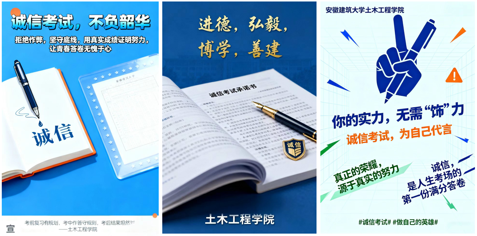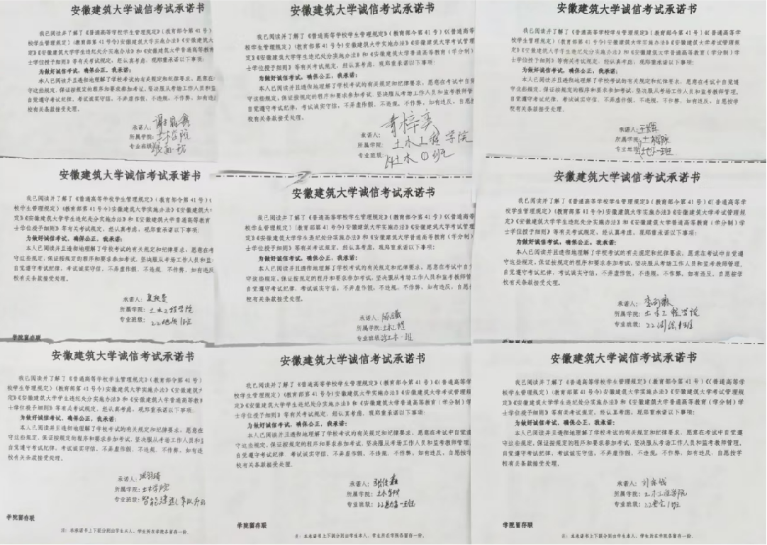本网讯 为进一步加强学风建设,引导学生树立诚信考试理念,营造公平公正、风清气正的考试氛围,土木工程学院开展了以“争做诚信考生,共建优良考风”教育活动,通过主题班会、签订承诺书、海报设计及签名等形式,引导全体学生树立诚信应考意识,筑牢道德防线。 主题班会传理念 诚信意识入人心 为将诚信理念转化为实际行动,各班级召开诚信考试主题班会,辅导员们结合《国家教育考试违规处理办法》《beats365官方唯一学生违纪处分实施办法》等规章制度,结合典型违纪案例,向同学们详细解读了考试作弊的认定标准、处理流程及严重后果。从“一念之差”导致的学业危机,到诚信缺失对个人成长的长远影响,一个个真实案例让同学们深刻认识到诚信考试的重要性。