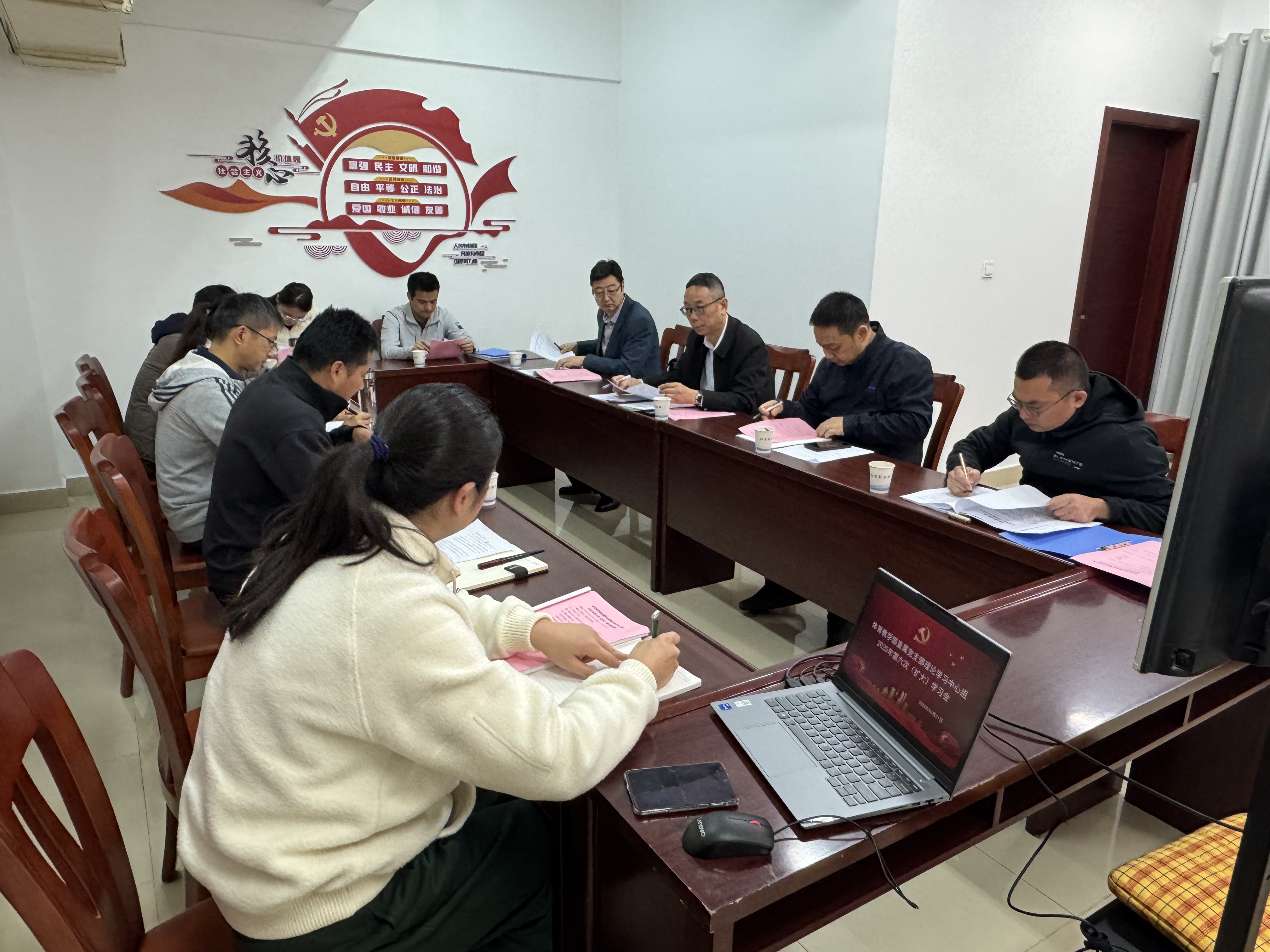 本次学习会议分“第一议题”学习、专题学习、交流研讨三各环节进行。在“第一议题” 学习中,徐飞领学《习近平谈治国理政》第五卷“一体推进教育科技人才事业发展”,强调要把立德树人、科技自立自强、人才引领驱动贯通融入体育育人全过程。随后进行专题学习,杜卫提领学“推进国家安全体系和能力现代化”,李晓冉领学《习近平总书记关于体育的重要论述》之“弘扬中华体育精神”,全体成员集中观看央视新闻《迈上体育强国路》。徐飞还带领逐条学习《党政机关厉行节约反对浪费条例》,要求把“过紧日子”内化为部门文化。