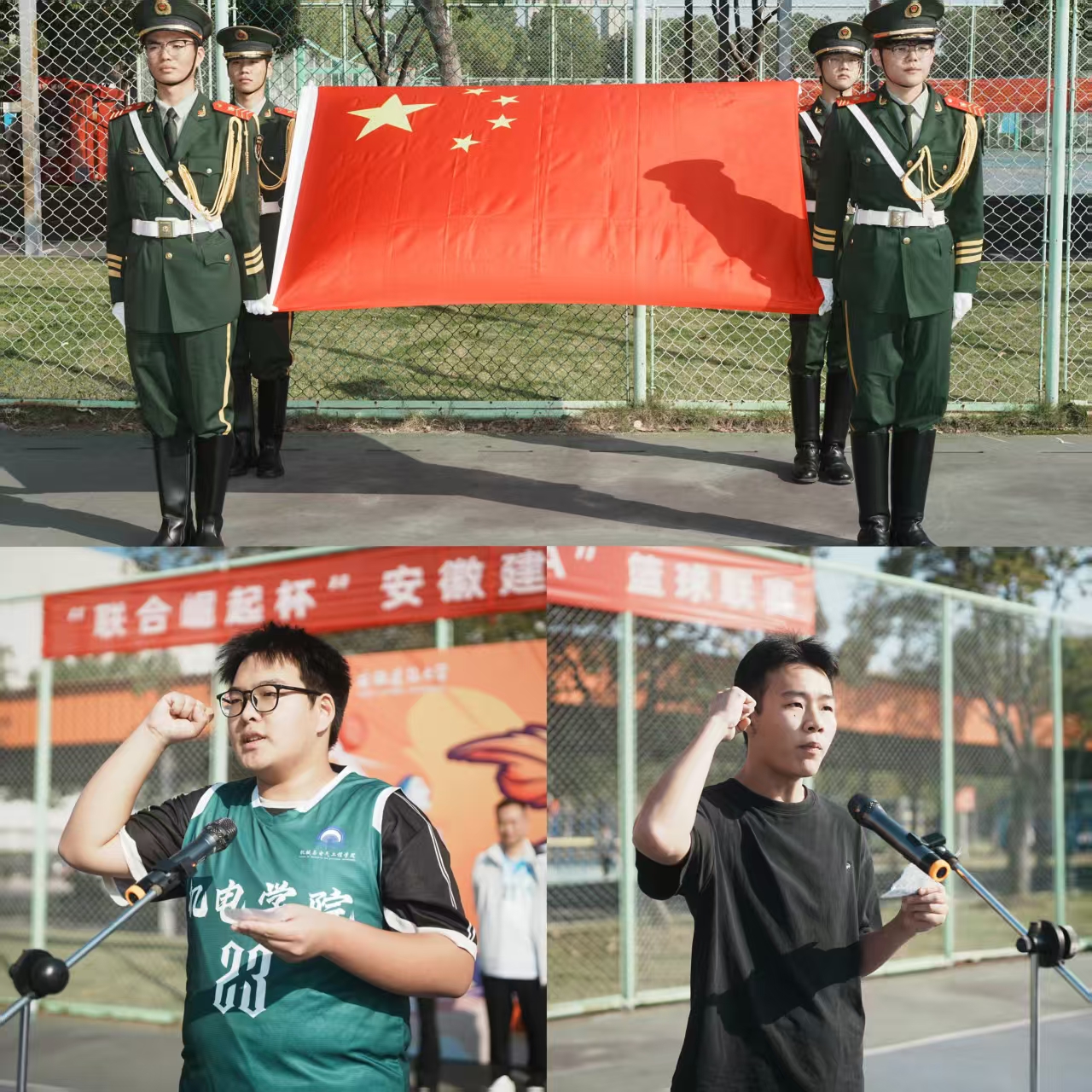 秋高气爽,晴空万里。伴随铿锵鼓点,校舞龙舞狮俱乐部的同学们翻腾跃动,龙须迎风、狮尾生风,为即将打响的篮球联赛点燃火热气氛。国旗班队员步履铿锵,护送五星红旗踏过中场,全场肃立,雄壮的国歌声响起,庄严肃穆,青春的赛场在这一刻与家国同辉。