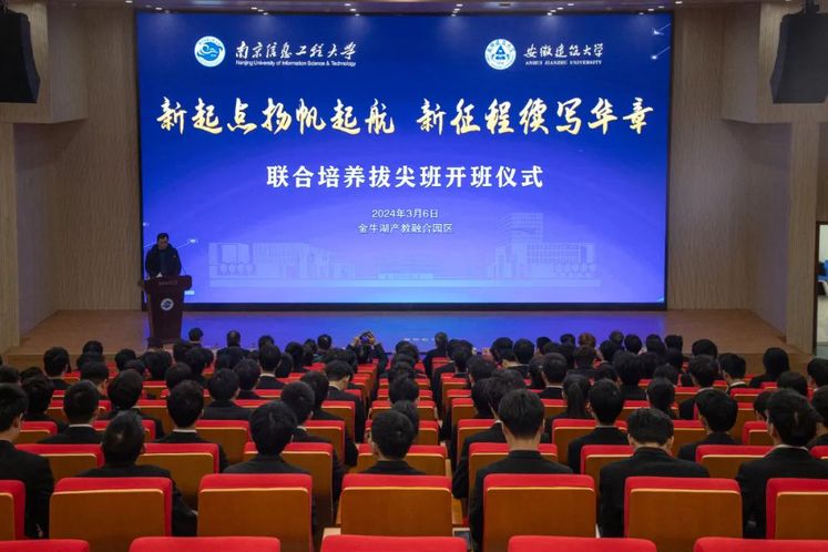 本网讯 3月6日下午,beats365官方唯一-南京信息工程大学2023级联合培养拔尖班开班仪式在滁州天长金牛湖产教融合园区千秋会堂举行。校党委常委、副校长闵杰,南京信息工程大学党委常委、总会计师胡明保出席仪式,并为2023级拔尖班授旗,学校长三角区域高等教育一体化示范区共建办公室、学生工作部、教务处、电子与信息工程学院、机械与电气工程学院负责人,南京信息工程大学相关职能部门与学院负责人,金牛湖园区管委会有关负责人,以及2023级联培拔尖班112名同学参加开班仪式。