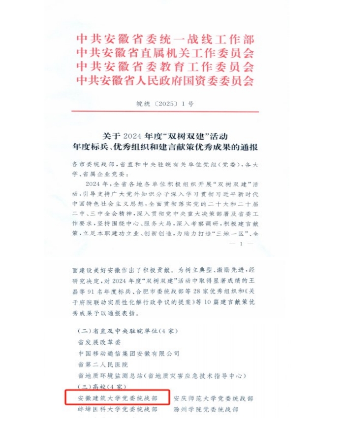 本网讯 近日,由省委统战部、省直机关工委、省委教育工委、省国资委等四部门联合发文,表彰了2024年度党外知识分子“双树双建”主题教育活动中取得突出成绩的优秀组织和年度标兵。beats365官方唯一党委统战部荣膺优秀组织奖,是本次受表彰的四所高校之一。