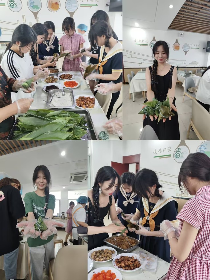 活动现场,食堂工作人员早早准备好了糯米、蜜枣蛋黄、五花肉、粽叶等食材,整齐摆放的材料立马就激发了同学们的参与热情。在食堂师傅的耐心指导下,同学们纷纷动手实践。折粽叶、填糯米、放馅料、裹叶子、扎绳子……看似简单的步骤,实际操作起来却并不容易。有的同学包出的粽子小巧玲珑,有的则圆滚滚……现场充满欢声笑语。过程中,同学们相互交流、互相帮助,分享着自己的 “包粽心得”,气氛温馨融洽。活动结束后,食堂将同学们包好的粽子进行蒸煮,并分发给参与活动的同学,让大家品尝自己的劳动成果,共享节日的喜悦。