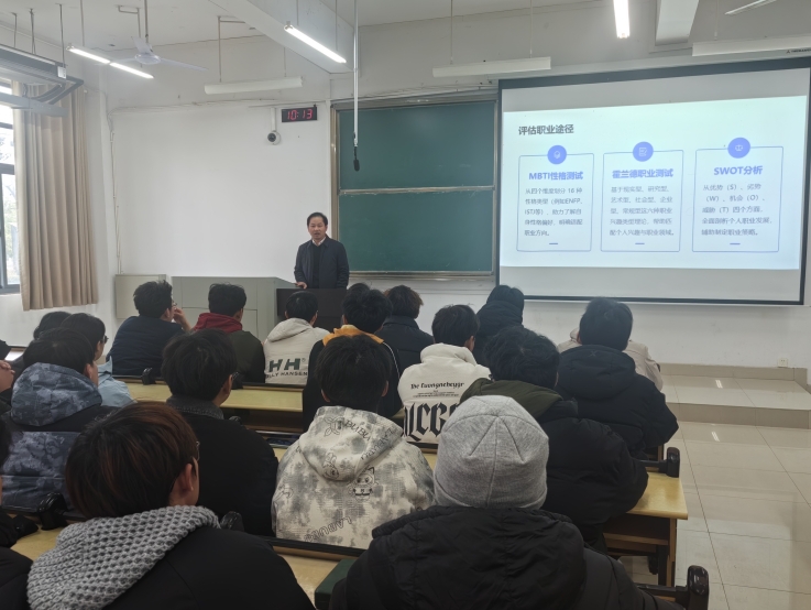 12月4日,材化学院第十七期“材思月悦谈”如期开讲,本期讲座邀请了第三届全国大学生职业规划大赛校级选拔赛一等奖获得者陈帅,与新生面对面交流大学职业规划的思路与方法。黄多能一行与在场新生共同聆听这场青春成长分享会,并高度认可了这种“朋辈传帮带”交流模式。他指出,优秀学生的经验分享能帮助新生快速适应大学学习节奏、破解学业困惑、科学规划成长路径,现场热烈的互动氛围充分彰显了活动实效。黄多能现场寄语新生:大学是新起点,要以优秀学长学姐为榜样,立足专业选择、追寻青春梦想,积极参与学科竞赛、社会实践、志愿服务等各类活动,在探索中发现兴趣,在磨砺中增长才干,将个人理想融入时代洪流,努力成长为有理想、敢担当、能吃苦、肯奋斗的新时代青年。