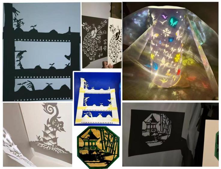 “万物向光·自然焕彩”光影设计活动鼓励学生以简单材料探索光与影的艺术魔力。同学们围绕“生命力”主题,在纸板上镂刻、绘制出向阳的向日葵、逐光的蝴蝶、破土的新芽等积极意象,再利用光源与自制投影装置,将图案投射于墙面。通过不断调试角度与距离,让光影下的自然元素焕发出清晰而动人的细节。学生通过形态塑造与光影构图,传递“追光而生”“向上成长”的精神内涵,实现了自然之美、艺术之趣与积极心智的有机融合。