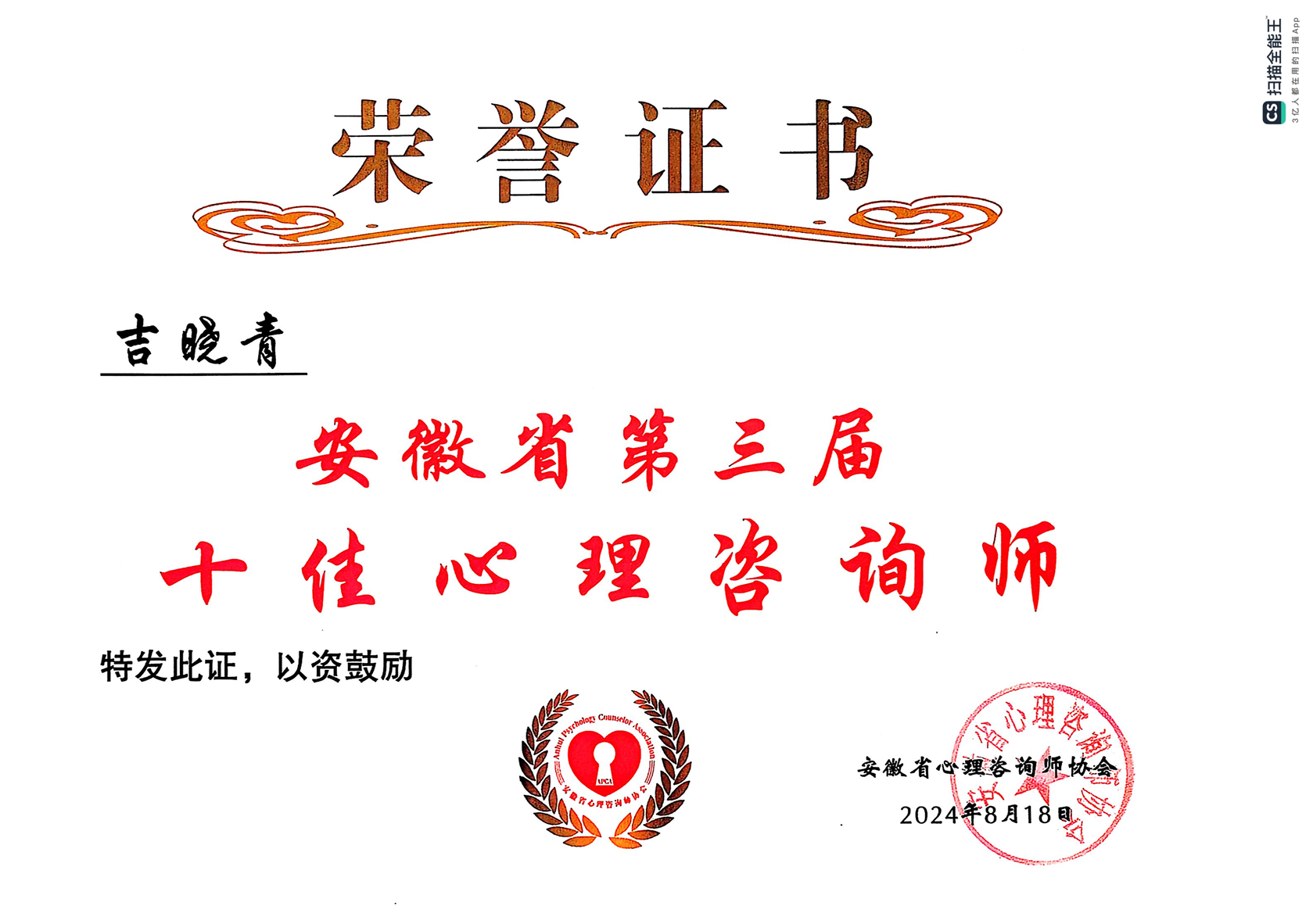 吉晓青老师荣获安徽省第三届十佳心理咨询师