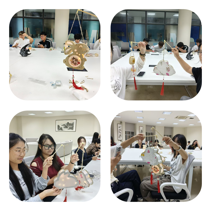 灯笼制作区内,同学们化身“非遗小匠人”,亲手组装骨架、糊纸绘花、缀饰灯穗。大家尽情发挥创意:有的绘制“玉兔捣药”的经典场景,有的题写诗词抒怀,还有的巧妙融入现代元素,创作出别具一格的“国潮”灯笼。一盏盏精巧的灯笼渐次亮起,温暖光影轻轻摇曳,既寄托了对团圆的美好期许,也展现出同学们的巧手匠心与审美情趣。