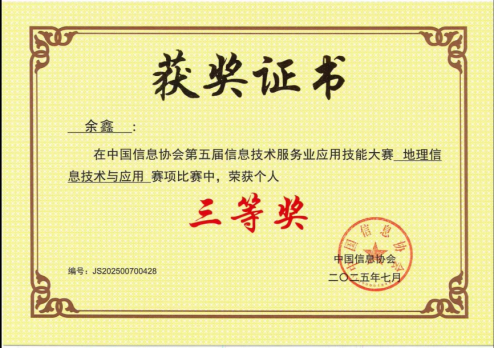 保研之路,绩点是基础,科研与竞赛亦不可或缺。余鑫从大一起便开始参与各类竞赛。大一下学期,他参加了校内数学竞赛。当时专业课程任务繁重,包括大学物理、测量学、地图学等,他在保障课业学习的同时,将大量课余时间投入备赛——反复练习、不断总结,最终荣获校赛二等奖。此外,余鑫也多次参加实践类比赛。2025年的GIS应用技能大赛备赛期间,他承担队员与教练的双重角色,将专业知识、逻辑推理与现实情境深度融合,亲自为学弟学妹演示实验操作、总结重难点,有效提升了团队的实践能力。在赛前一个月,小队成员长时间扎根实验室,最终努力换来回报,团队荣获国赛二等奖。