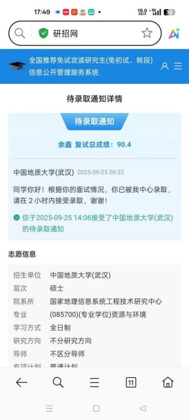 今年9月,余鑫凭借优异的综合表现成功获得保研资格。在保研准备中,他认真思考未来研究方向,积极搜集院校与导师信息。本校老师是了解保研信息的重要窗口,他积极向老师们了解院校信息,了解到中国地质大学是GIS方面的热门高校,且其研究领域与余鑫个人感兴趣的土地利用等相契合,最终确定其为目标院校,之后在相对紧张的时间内准备好简历,套磁信等文书材料。在面试中,导师的问题多围绕其实践经历与科研项目展开,从研究原理、框架到细节,逐步深入。面对提问,余鑫从整体到局部清晰阐述了项目内容,获得了考官的认可。若无前三年专业知识的持续积累与科研项目的亲身实践,他难以在面试中表现得如此从容。这些经历,最终成为他保研之路上的坚实“垫脚石”。余鑫认为文书材料的准备是保研过程中的“临门一脚”,好的文书材料一定要突出自己的个人优势,让导师了解你的个人价值。