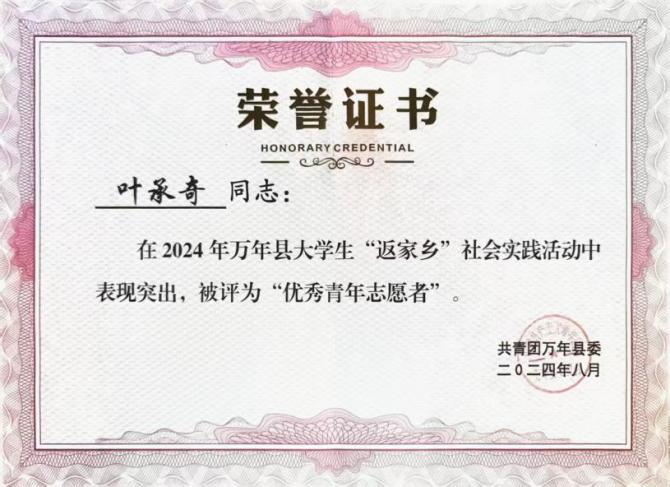 公益实践中,他是校65周年校庆的“优秀志愿者”,是暑期“三下乡”社会活动中向村民讲解环保知识的宣传员,更是家乡“河小青”志愿队的常客,总志愿时长达300余小时。外语竞赛获奖、辩论赛夺魁、连续三年完成校乐跑任务,德智体美劳全面发展的他,恰如一束暖光,在奉献中诠释着“自强不息、勇于奋斗”的青春底色。