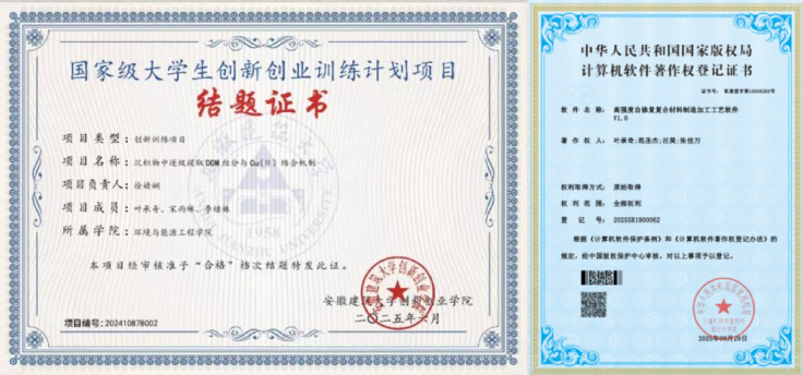为筛选最优吸附效能,他效仿“拓荒牛”的钻研精神,协助合成材料,改进实验参数,记录吸附效率数据,时常在实验室待到深夜,最终实现高效吸附抗生素污染材料的研发攻关,研发成果具有高可重复使用性和在水体抗生素去除领域的广阔应用前景。这份坚持让他逐步成长为科研骨干:先后主持/参与国家级大学生创新创业训练计划项目等共9项,研究覆盖水处理、节能减排等前沿领域。在《Journal of Water Process Engineering》《Desalination and Water Treatment》《环境科学与技术》等国内外权威期刊发表论文5篇,授权国家发明专利1项,登记软件著作权2项,用成果回应着时代对环保科技的呼唤。