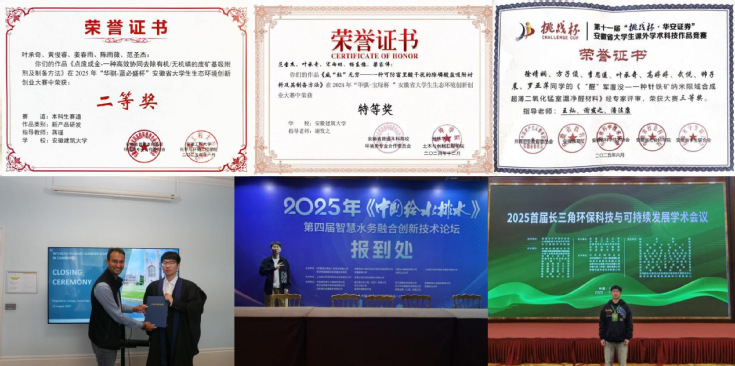 创新创业赛场是他转化成果的舞台。他同团队成员一起研发的“一种可防富里酸干扰的除磷酸盐吸附材料及其制备方法”和“一种高效协同去除有机/无机磷的废矿基吸附剂及制备方法”,分别斩获2024年和2025年安徽省大学生生态环境创新创业大赛特等奖和二等奖;参与的“醛军覆没——一种针铁矿纳米限域合成超薄二氧化锰室温净醛材料”项目,获“挑战杯”安徽省三等奖。他还远赴英国剑桥大学参加夏校,以“A+”成绩结业,将国际前沿的生态修复技术理念带回校园,在“智慧水务融合创新技术论坛”和“长三角环保科技与可持续发展学术会议”交流学习,为绿色发展注入青春智慧。