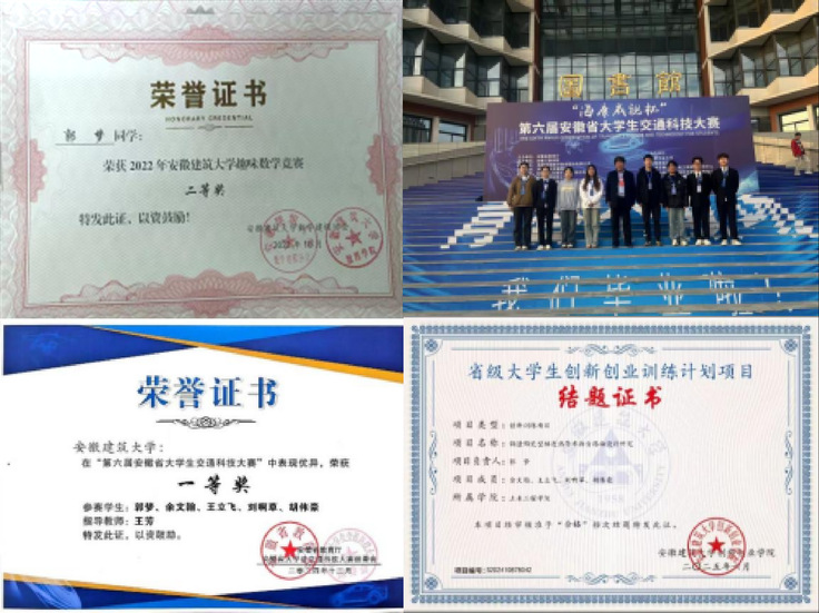 竞赛与科研方面,郭梦同学从大二起便主动积累,紧扣交通工程专业方向多维度锤炼综合能力。竞赛场上,她兼顾学科基础与专业应用,多次参加校级、省级比赛,在趣味数学竞赛中斩获二等奖、互联网+校级铜奖等。同时,她深耕专业赛事,凭借扎实的专业积累荣获第六届安徽省大学生交通科技大赛一等奖。交科赛中,她主动与同学交流经验、排查问题、参与试件制备,在一次次试错与总结中沉淀心境,最终成功斩获赛事一等奖。科研领域,她积极参与省级大创项目,从前期调研到实践落地全程投入,积累了扎实的实践经验,在指导老师指导下推进相关研究,从文献检索、框架搭建,到参数调试、难题攻坚,每一步都全力以赴,科研能力与抗压能力得到大幅提升。