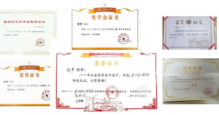 学业上,郭梦同学始终秉持严谨治学态度,身为班级学习委员,她不仅严于律己,更主动带动班级学风。课堂上专注捕捉重难点,课后充分利用晚自习刷题巩固,遇有疑难便主动请教老师,绝不遗留知识盲区。面对专业核心课程,定期梳理知识框架,同时主动借阅专业拓展书籍拔高能力。高数学习中,她注重教材案例理解、熟记公式定理、强化课后练习,还刻意积累创新题目深耕细研,在期末考试中获得90分的好成绩。三年来,她平均绩点4.14稳居专业第一,多门核心课程成绩达90+,曾先后荣获苏州建工奖学金、校一等奖学金、校二等奖学金等。