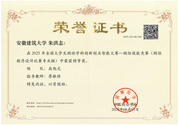 为检验所学,朱洪志参加了全国大学生测绘技能竞赛程序设计赛项。他与队友并肩备战,不断优化算法、模拟真实工程问题,最终荣获国家级特等奖。竞赛不仅锻炼了朱洪志将复杂问题模型化、寻求最优解的能力,更让他对测绘信息化与智能化的未来充满信心。