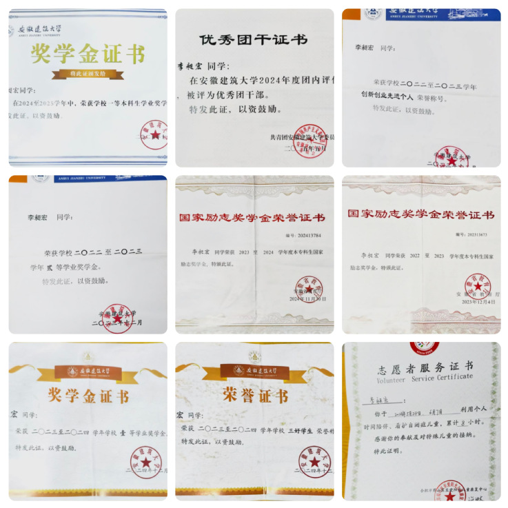荣誉表彰:李昶宏连续两年获得“国家励志奖学金”和“校学业一等奖学金”,这些荣誉不仅是对他学习态度的肯定,更成为了他保研之路最坚实的底气。