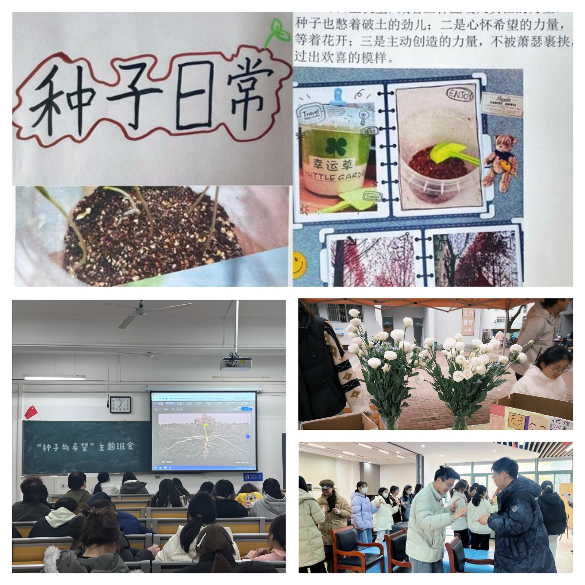 围绕冬季蓄势待发的特点,“生命与希望”感悟系列启发学生深度思考生命力量与成长意义。公管学院通过“种子与希望”主题班会观看种子破土视频,感悟“向下扎根,向上生长”的生命韧性;数理学院的新生破冰行动有效消除了同学间的距离感;材化学院的鲜花赠送则寓意着心灵的希望与绽放,传递出温暖向上的积极能量。