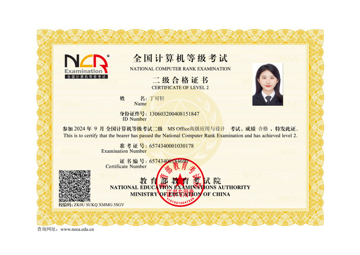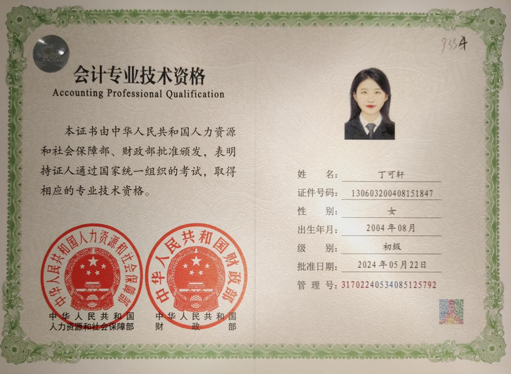 丁可轩重视职业相关资格的积累,坚持“在精不在多”。她于大二通过英语四六级,并利用三个月集中备考,以优异成绩取得初级会计职称。此后,她又高效通过全国计算机等级考试与普通话水平测试。她认为,考证不应盲目追求数量,而应服务于长远规划,且需注重学习效率与方法。在紧张备考之余,她也注重劳逸结合,保持积极从容的心态。