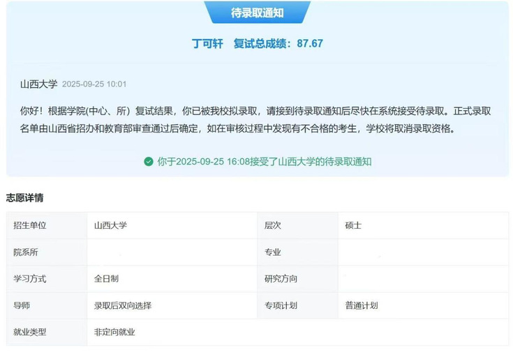 获得资格后,丁可轩迅速进入复试备战状态,以高效的节奏推进备考工作。她聚焦《财务会计》《财务管理》等核心课程展开系统性复习,夯实专业理论基础;同时针对性加强英语口语专项训练,全面提升综合应试能力。最终她凭借复试中的沉稳表现与扎实功底,成功被山西大学录取。这段保研经历让她深刻领悟到:机会垂青有准备的人,唯有在日常做好知识与能力的积累,才能在机遇来临时牢牢把握;在面对人生选择时,要勇于突破自我设限,大胆尝试;更要学会倾听并采纳关键建议,为前行之路指引方向。