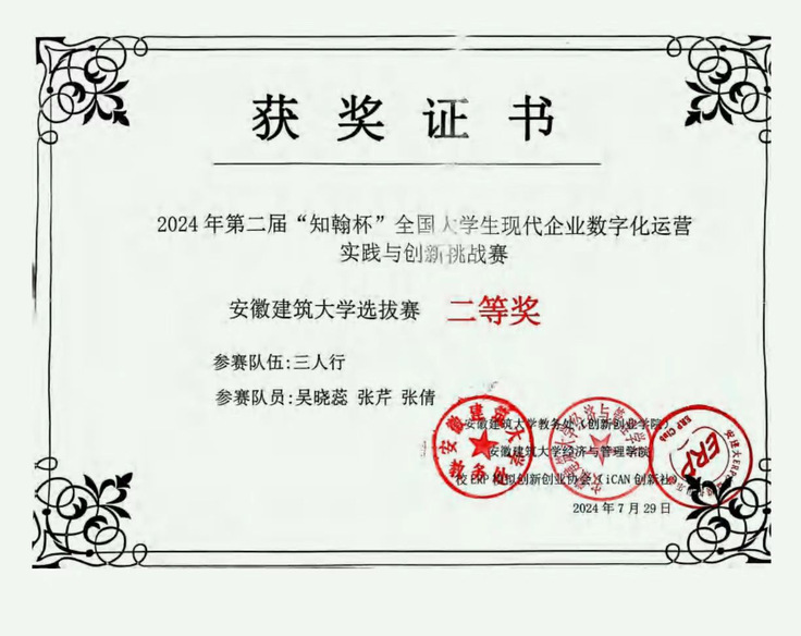 在专业课的学习之余,张芹会参加一些竞赛拓展视野,以实践巩固知识运用。其所在团队认真完成第二届安永ESG大学生创新挑战赛复赛的赛事比拼,并获第九届“科云杯”大学生财会职业能力大赛校三等奖、第二届“知翰杯”全国大学生现代企业数字化运营实践与创新挑战赛校二等奖、2024年大学生财税技能大赛技能赛校三等奖、“新道杯”数智财经大赛校三等奖等荣誉奖项。
