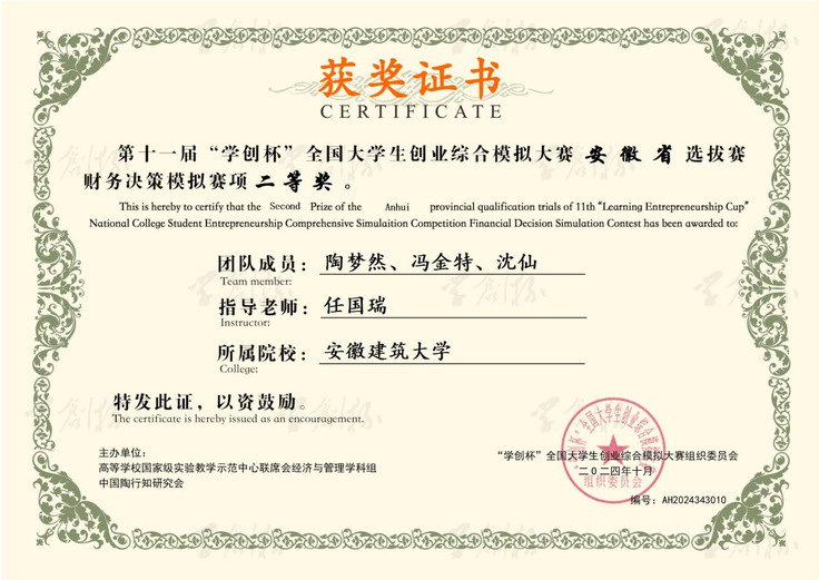沈仙不满足于课本理论知识的学习,主动寻求理论知识向实践能力转化,在学科竞赛的舞台上不断突破自我、挑战极限。她深谙会计学作为实践性极强的应用学科,唯有扎根实践方能悟透理论精髓。为此,她踊跃投身各类学科竞赛,在竞赛中,她与团队成员紧密协作、并肩作战,从项目精准选题、方案科学设计到现场从容答辩,每一个环节均以严谨细致的态度精益求精。最终,小组凭借独到的解题思路与扎实深厚的专业功底脱颖而出,斩获多项佳绩。这些经历不仅深化了她对专业理论的系统性理解,更积累了宝贵的实操经验与团队协作能力,为专业成长筑牢实践根基。