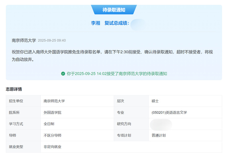 面试是保研的最后一道难关,面对考核,李湘从容不迫、条理清晰地展现了三年来的积累与思考。这份从容,源于日常学习的厚积薄发,源于竞赛场上的千锤百炼,更源于科研实践中的深入探索。最终,她凭借出色的综合表现,成功斩获南京师范大学的录取通知,圆了自己的读研梦想。