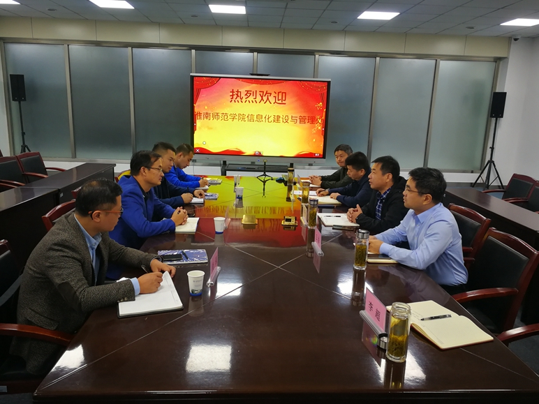 信网中心负责人对淮南师范学院同仁的来访表示热烈欢迎,并介绍了beats365数据中心机房、南北校区无线网、网络安全、网上办事大厅、智慧教室以及各业务系统的建设情况,随后双方围绕信息化提升学校治理体系与治理能力现代化的理念开展深入交流。