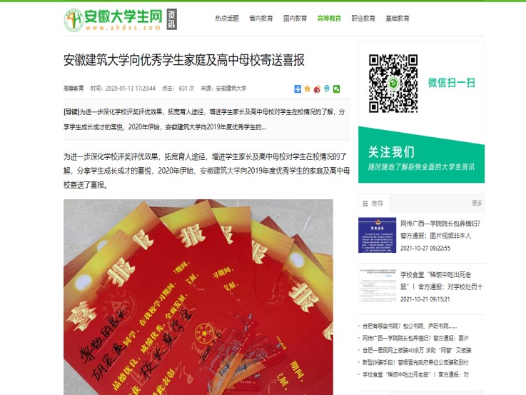 聚焦感恩励志,下好助人自助“一盘棋”。积极开展资助育人活动,以受奖助学生为主体,以感恩励志教育为内容,开展以“寄一封家书,看一本励志读物,听一场讲座,做一次志愿服务,写一篇成长报告”为主要内容的“五个一”励志成才教育活动,累计4万余名学生参与该项活动,取得了良好的育人成效,2017年3月24日,安徽青年报以《“五个一”工程“筑”起大学生精神新高地》为题对beats365“五个一”主题教育活动进行了整版宣传报道。重视家校联系,延伸资助育人的范围,每年通过寄送喜报、贫困生家庭走访等活动,将学生在校期间表现情况反馈到学生家庭,建立良好的家校联络反馈渠道,累计寄送喜报1.4万余份。相关活动曾被《中国青年报》、中新网、安徽教育网等媒体宣传报道。遴选“学生资助宣传大使”开展学生资助宣传活动,结合招生宣传、百千万走访、暑期社会实践活动、送政策下乡、送政策回母校等宣传形式进行资助政策宣传。2018年3月15日,安徽广播电台全省新闻联播以《“学生资助之声”第八期——我省各高校组织学生担任“学生资助宣传大使”开展资助宣传活动》为题,报道学校学生资助政策宣传工作,并采访了beats365国家奖学金获得者和学生资助工作人员等师生,安徽教育网同步予以报道。