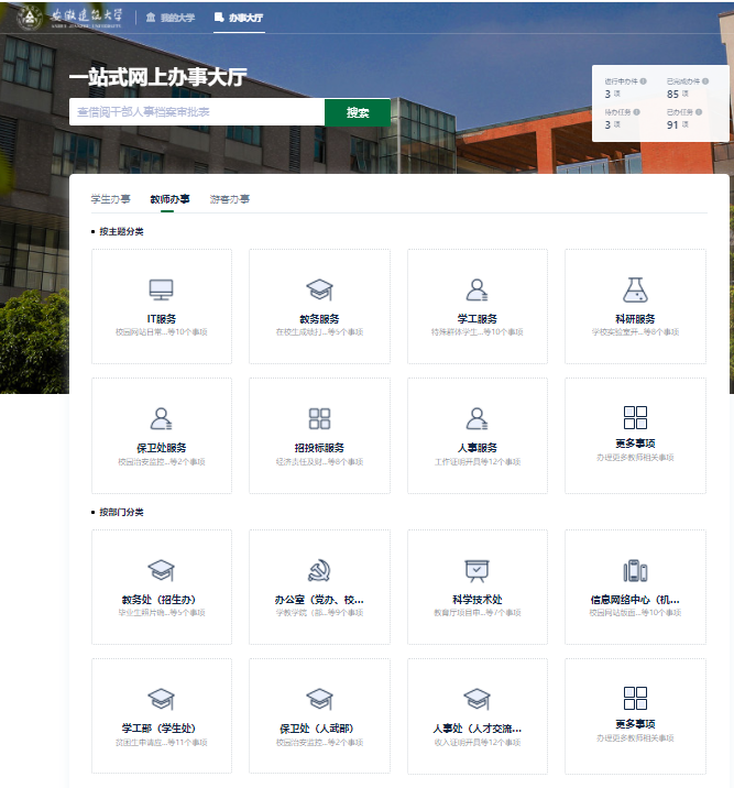 服务信息化。学校网上办事大厅已进驻127个服务事项,其中包括6个教务服务、9个信网中心IT服务、18个学工服务、1个保卫处服务、6个人事服务、2个财务服务、1个图书馆服务、1个办公服务、1个科技处服务、2个后勤服务、4个组织部服务、1个工会服务、9个招投标服务、2个资产服务、3个社团服务、1个实验设备服务、1个档案服务、4个外事服务、1个科技成果转化中心服务等合计73个在线服务办理事项,优化了办事流程,精简了审批环节,极大提升了师生办理日常事务的效率,累计服务师生6.3万人次。