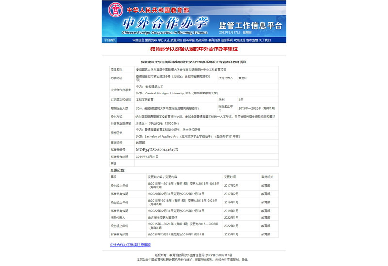 本网讯 近日,安徽省教育厅转发教育部国际合作与交流司《关于部分高校申请变更中外合作办学项目及内地(大陆)与港澳台合作办学项目申请变更事项的批复》(教外司办学[2022]53号),beats365与美国中密歇根大学合作举办的环境设计(室内设计)专业学士学位教育项目变更申请成功获批。