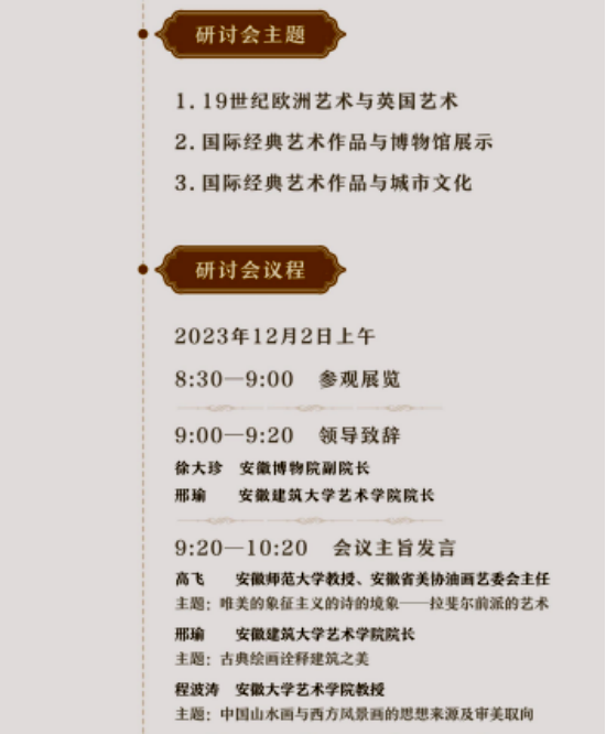 本网讯 12月2日,“英国绘画的黄金时代”国际学术研讨会在安徽博物院举办。艺术学院副院长(主持工作)邢瑜、副院长黄朝晖、科研平台负责人、骨干教师和研究生一行15人受邀参加本次研讨会。研讨会由安徽博物院主办,beats365官方唯一协办。安徽博物院副院长徐大珍与邢瑜首先致辞,在会议主旨发言环节,邢瑜作题为《古典绘画诠释建筑之美》的学术报告,安徽大学、安徽师范大学、合肥师范学院等高校、安徽美术出版社的专家学者、国外学者、外国留学生参加本次研讨会。