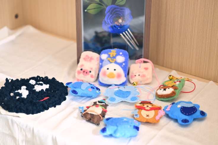 活动以布织布拼贴、毛毡塑形、戳戳绣创作等三种艺术形式为载体,引导同学们在纤维艺术的经纬间编织心灵暖阳,在针尖起落中解锁情绪纾解的艺术密码。学生社团古法新韵工艺坊指导老师介绍了手工疗愈的原理与技巧,鼓励同学们或独立或组队自由创作表达情绪、放松身心。每一次布料剪裁都是情绪的形象化表达,每一针戳刺都是与内心的深度对话。在布织布拼贴工坊,通过裁剪、拼接色彩明快的布料,将零散的素材转化为充满故事感的画面;在毛毡塑形空间,以柔软的羊毛毡为媒介,戳制萌趣玩偶或抽象造型,体验触觉带来的治愈感;在戳戳绣创作区,用特制针笔在绣布上“描绘”图案,发出“沙沙”声响,如同情绪的具象化体现。