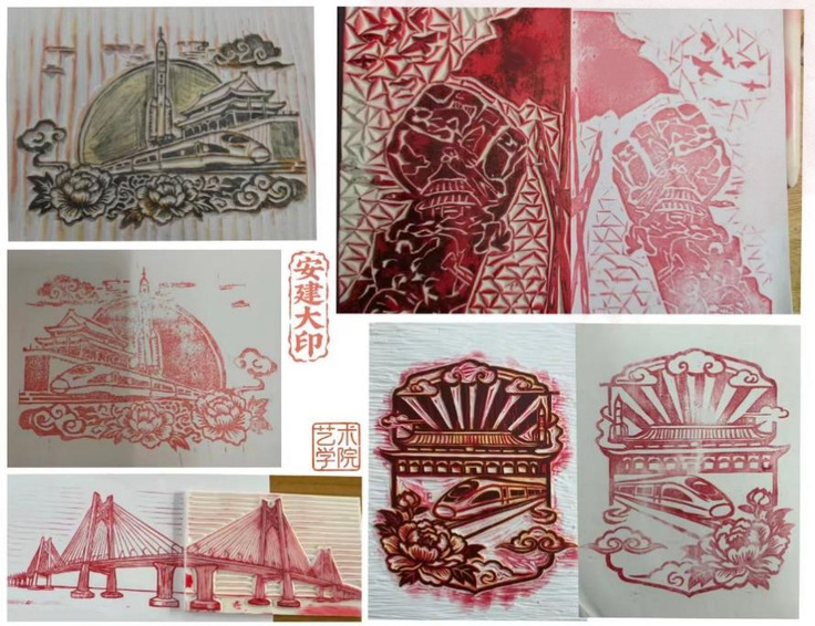 同学们充分发挥巧思与创意,以利落简练的线条,生动刻画高铁穿梭于山河、火箭直冲云霄的壮阔时代图景,定格国家发展的铿锵步伐;以细腻入微的刀工,精心雕琢故宫飞檐的精巧弧度、敦煌飞天的飘逸衣袂,让传统建筑的恢弘与古典艺术的灵动在橡皮上重现。同学们将华表、祥云等吉祥元素与现代城市剪影巧妙融合,让时代脉搏与文化瑰宝在刀起刀落间完美交融。大家在橡皮上精准勾勒轮廓、细化纹路,手持刻刀小心翼翼雕琢,聚精会神处理每一处细节,让图案在指尖逐渐成型。完成刻制后,以金色、朱红等寓意喜庆祥和的颜料精心上色,更通过单枚印章重复盖印形成整齐纹样、手写“国泰民安”“盛世繁华”等吉祥字句点缀、多块不同图案的橡皮章拼接组合成完整画卷等多样方式,让印绘作品更显丰富立体、意蕴悠长。