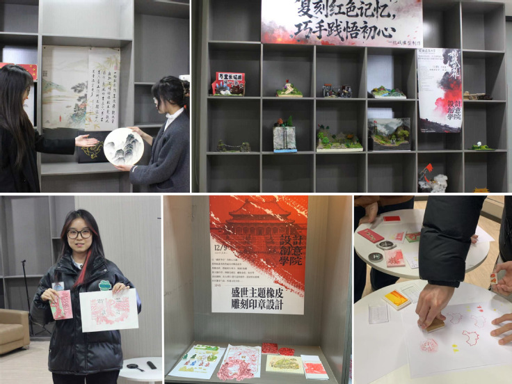 在观摩主旋律作品环节,同学们以“复刻红色记忆”微景观模型还原历史细节,“盛世华章”橡皮印章镌刻时代气象,“方寸织山河”钉子绕线画勾勒山河盛景,同时邀请了4位获奖同学来依次分享创作思路,以作品载红色与精神,以创意联青春与时代,将所学融入学业实践。