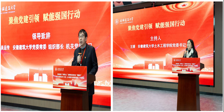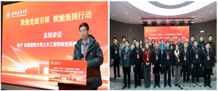 张宁作会议总结讲话。他表示本次活动是一次思想的“再充电”、一次责任的“再压实”、一次行动的“再动员”。五位党支部书记的精彩分享,既有理论深度的思考,也有实践鲜活的案例,充分体现了“强国行”专项行动团队第十小组“土木建筑与资源环境”这一学科集群的广度、深度与温度,更彰显了全省高校基层党支部在服务现代化美好安徽建设中的强劲活力与使命担当。下一步,学院也将持续深化“联”的机制,将平台优势转化为协同优势。精准聚焦“需”的导向,将专业优势转化为服务优势。牢牢把握“育”的根本,将党建优势转化为育人优势。